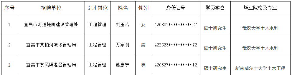 2024年宜昌市水利和湖泊局所属事业单位进校园(武汉大学站)人才引进拟聘人员公示公告